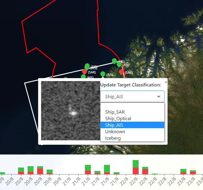 In Features: 20210304_091546_S1_1: AIS (class), <br></br> 20210304_091546_S1_2: AIS (class), <br></br> 20210304_091546_S1_3: AIS (class) <br></br>Then in metadata: 20210304_091546_S1 -> summary: AIS=3- The API then ingests those targets into Firestore. Because the targets are just simple points, we just store the points in the firestore database. Storage location of features collection in firestore: https://console.firebase.google.com/project/c-core-andoya/firestore/data/~2Ffeatures~2F0rbUCmTgyjp3bLYHmc4g